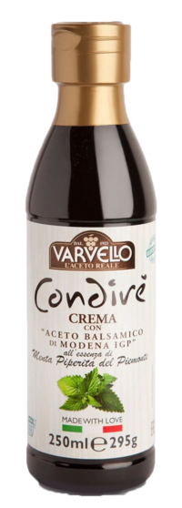 Varvello バルサミコクリーム ミント味 濃縮ブドウ果汁、モデナIGPバルサミコ酢39%、水、増粘剤(キサンタンガム)、天然香料ミント。